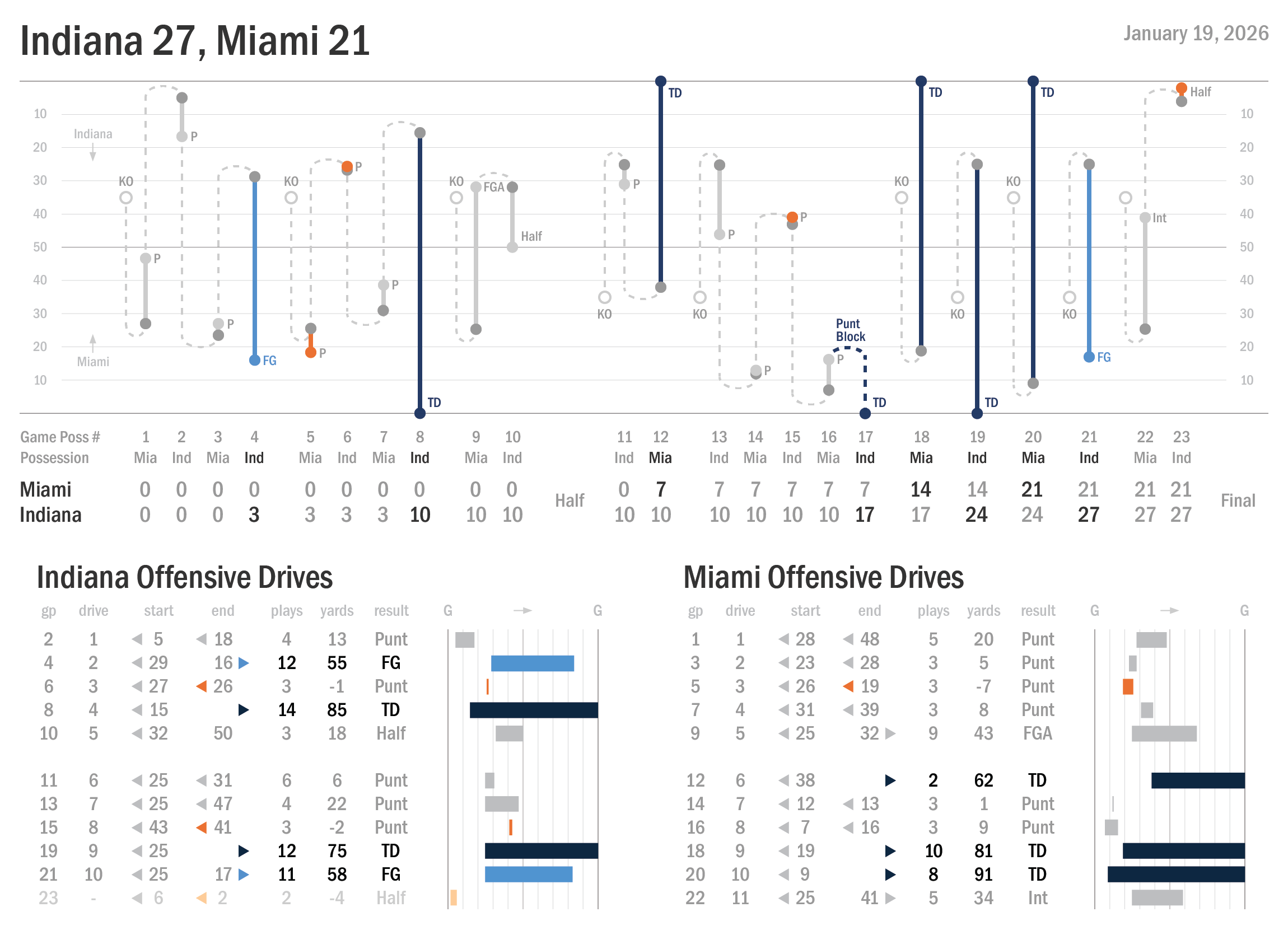 Data visualization of the CFP National Championship game played on January 19, 2026 and won by Indiana over Miami by a final score of 27-21. The visualization elements include a primary chart of the flow of alternating possessions, highlighting scores by each team and key possession change events. Illustrated tables at the bottom of the chart provide more specific information about Indiana and Miami’s respective offensive drive results.